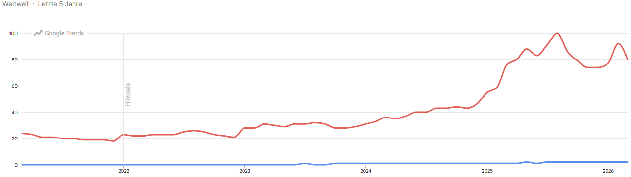 Google Trends: Suchvolumen nach “Matcha” (Rot) im Vergleich zum “Hojicha” (Blau)
